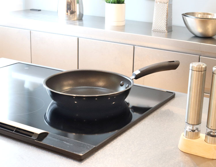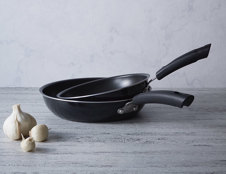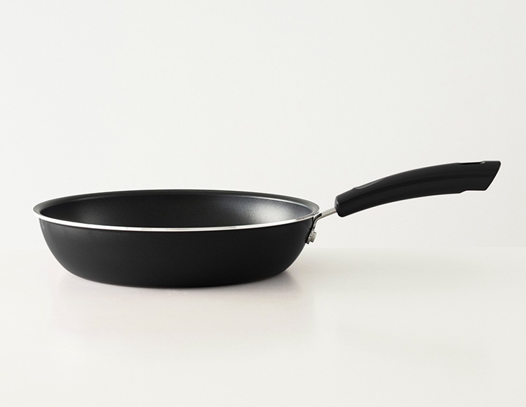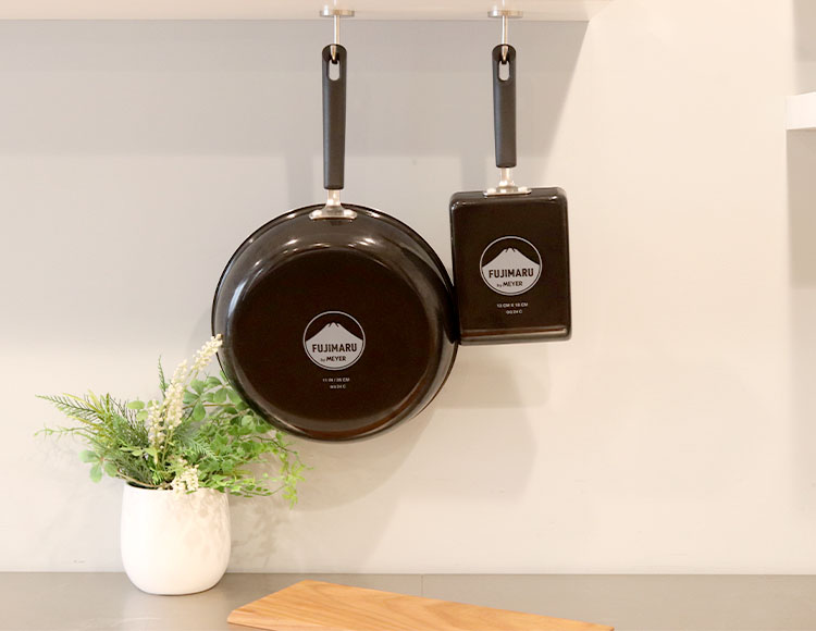 美しいブラックカラーに底面のFUJIMARUのロゴがキッチンに映えるフライパン。
