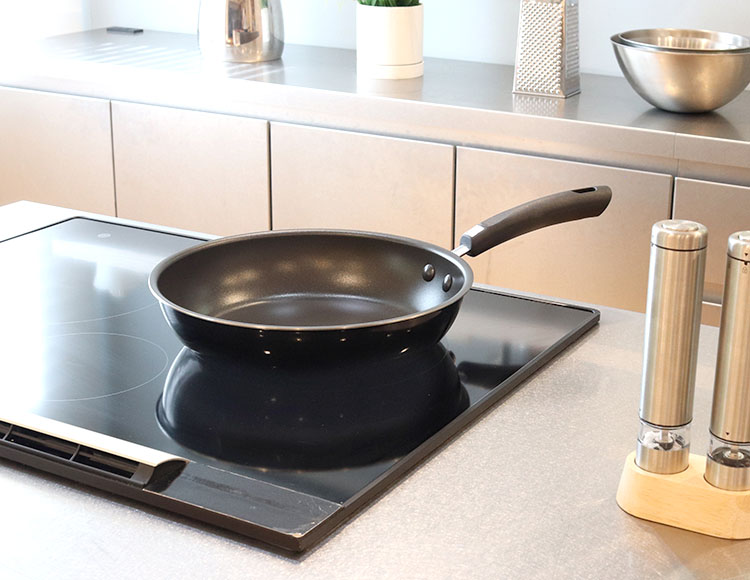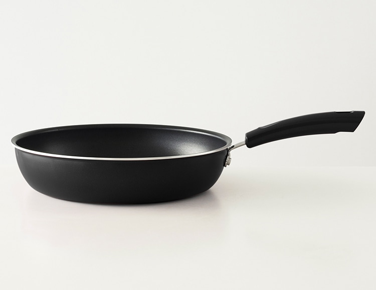 美しいブラックカラーに底面のFUJIMARUのロゴがキッチンに映えるフライパン。
