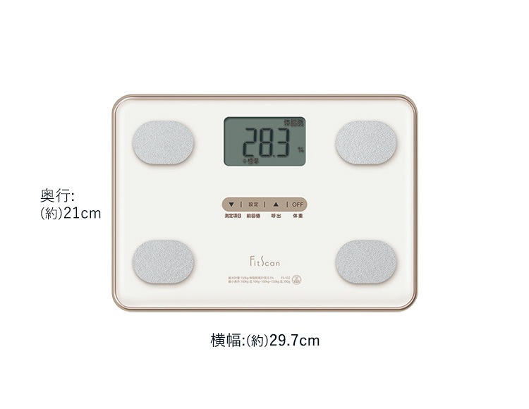 | 機能 | 体脂肪率測定 内蔵脂肪レベル BMI 計量範囲:0から150kg 電源:DC6V単4形乾電池(R03)x4本 消費電流:最大30mA |