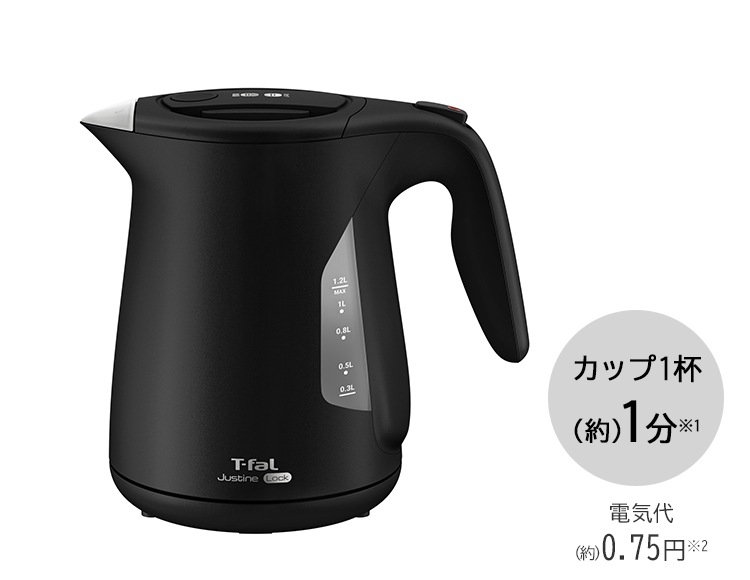 カップ1杯(約)1分でスピード沸騰。電気代(約)0.75円。*沸騰時間、電気代共にカップ1杯(140ml)の場合