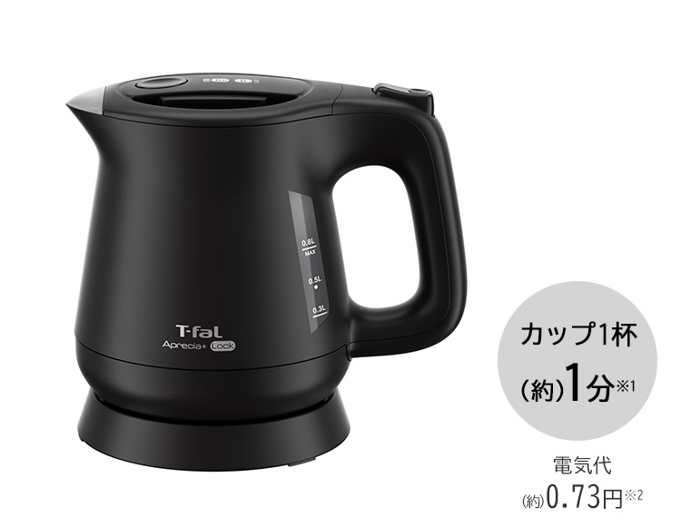 カップ1杯(約)1分でスピード沸騰。電気代(約)0.73円。*沸騰時間、電気代共にカップ1杯(140ml)の場合