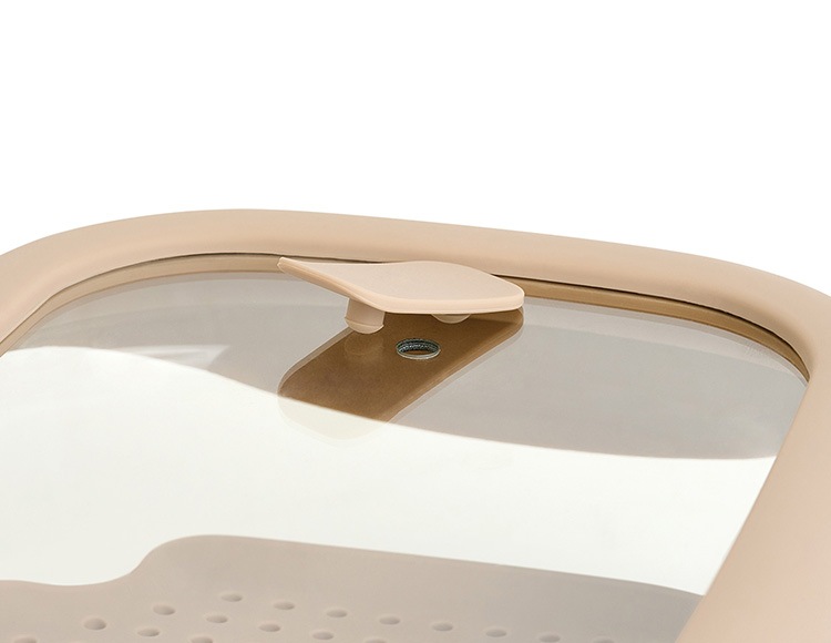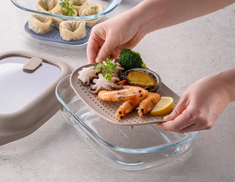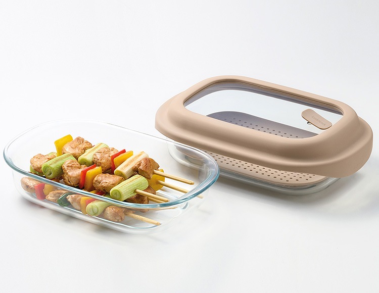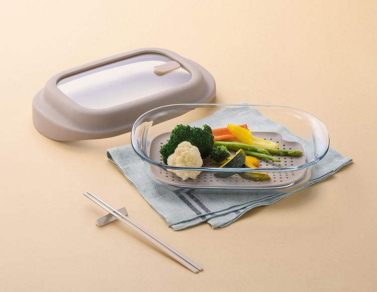 | 材質 | 本体:耐熱ガラス製器具(耐熱温度120℃) 蓋:強化ガラス(耐熱温度120℃)・シリコーンゴム(耐熱温度120℃・耐冷温度-20℃) 目皿:シリコーンゴム(耐熱温度120℃・耐冷温度-20℃) |