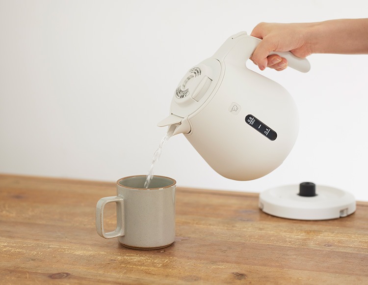 6つの安全設計(転倒湯もれ防止構造・蒸気セーブ構造・本体二重構造・自動電源オフ・空だき防止・給湯ロックボタン)が付いた0.8Lサイズのケトルです。