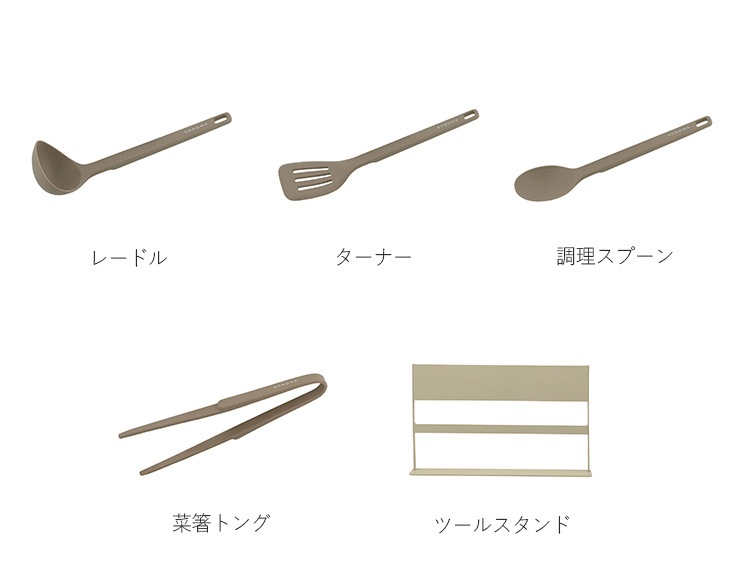 | 重量(約) | レードル:90g ターナー:80g 調理スプーン:70g 菜箸トング:120g ツールスタンド:1kg |