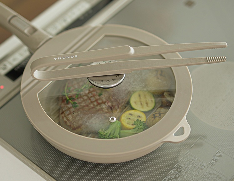 同シリーズのガラス蓋を使えばマグネットでくっつくため、調理中に一時置きも可能です。