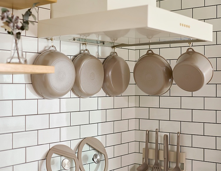 フライパン・鍋にフック穴が付いており壁に掛けられるので、収納にも困りません。