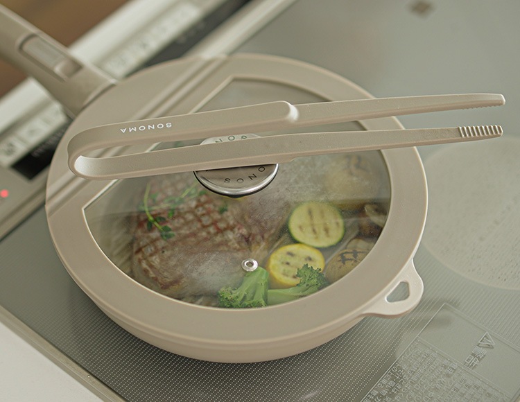 マグネット付きツールがフタのツマミにピタっとくっつき、調理中の一時置きに便利です。