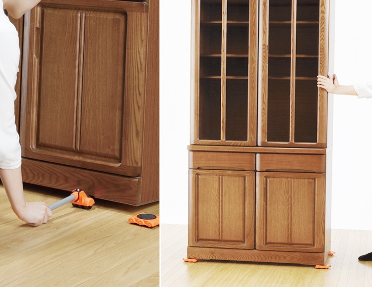 重たい家具も楽々持ち上げ。300Kgまでの重たい家具も楽々移動。家具転倒防止板付のお得なセットです。