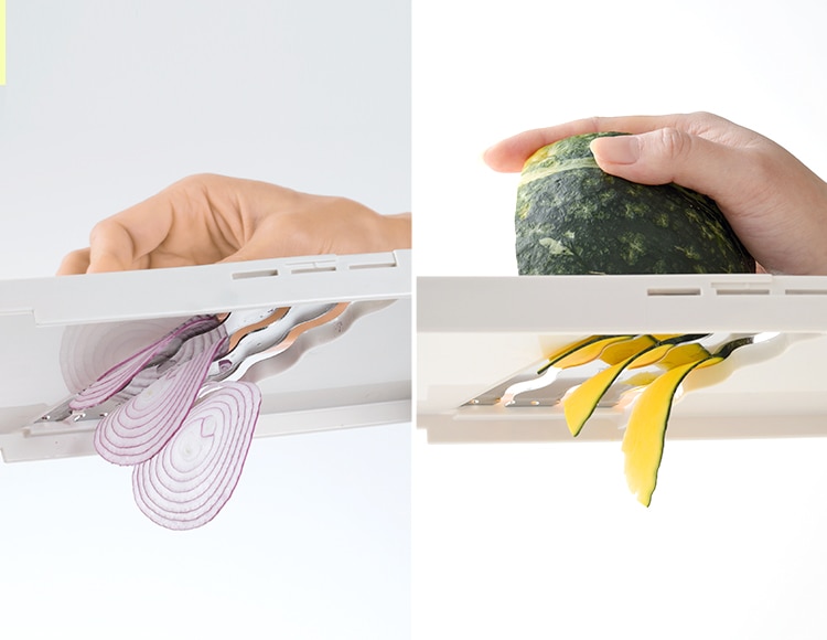 | 材質 | スライサー本体:ABS樹脂(耐熱温度80℃) 切れ刃:ステンレス刃物鋼 ホルダー:ABS樹脂(耐熱温度80℃) |
