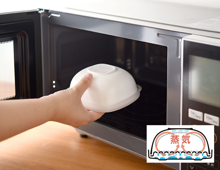 スノコで余分な水分が落ち、蒸しながら加熱されるのでふっくらもっちりに仕上がります。