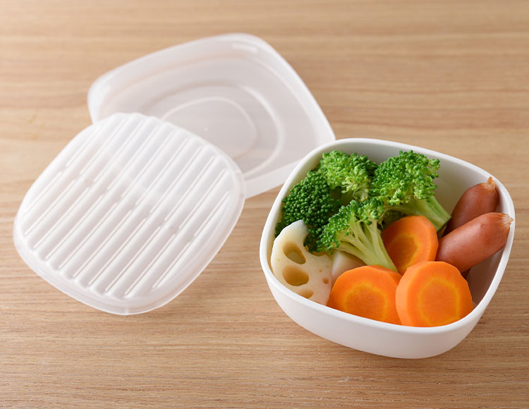 フタ(クリア)、スノコ(クリア)、容器の独自の構造で解凍後もベチャッとならない。