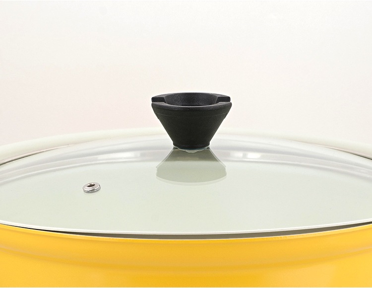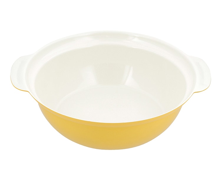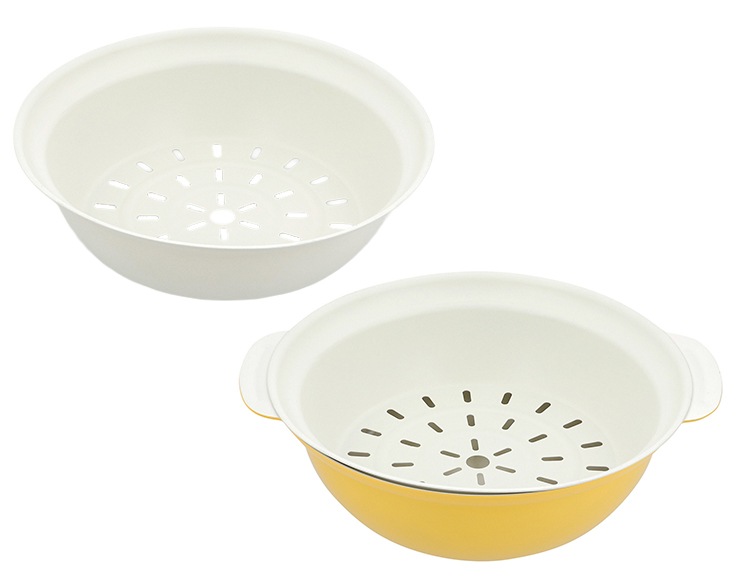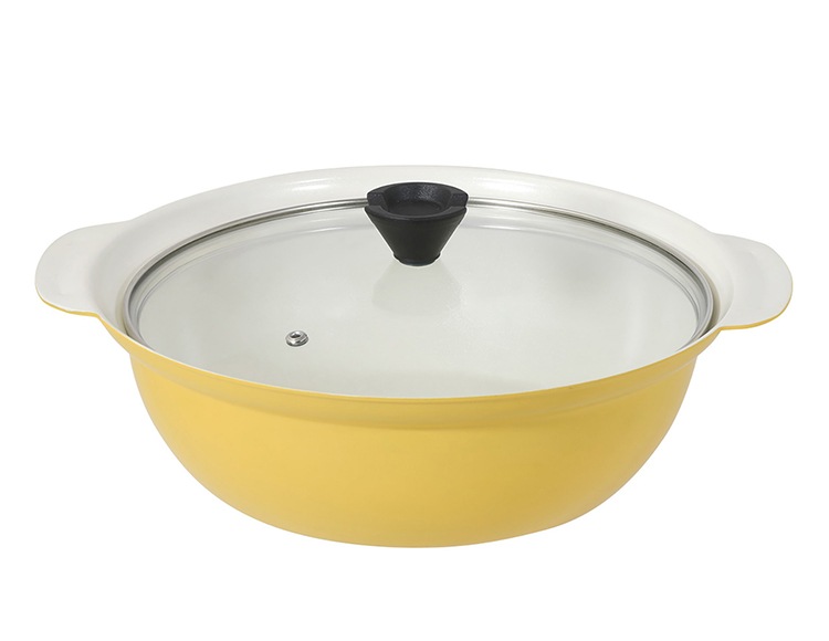 | 材質 | 表面加工/内面:セラミック塗膜加工、外面:(底面を除く)焼付け塗装、目皿:ふっ素樹脂塗膜加工 本体:アルミニウム合金 はり底:ステンレス鋼 ガラス蓋:品名:強化ガラス製器具 強化の種類:全面物理強化 縁リング:ステンレス鋼 ツマミ・ツマミの座板:フェノール樹脂 |