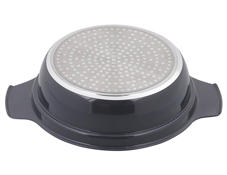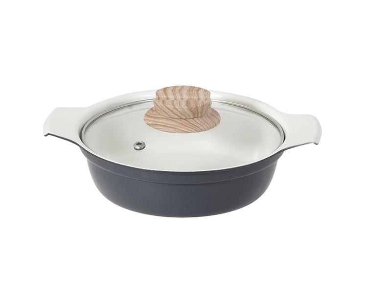 | 材質 | 表面加工/内面:セラミック塗膜加工 外面:(底面を除く)焼付け塗装 本体:アルミニウム合金(底の厚さ:2.4mm ※はり底を含む) はり底:ステンレス鋼(クロム16%) ガラス蓋:品名:強化ガラス製器具 強化の種類:全面物理強化 縁リング:ステンレス鋼 |
