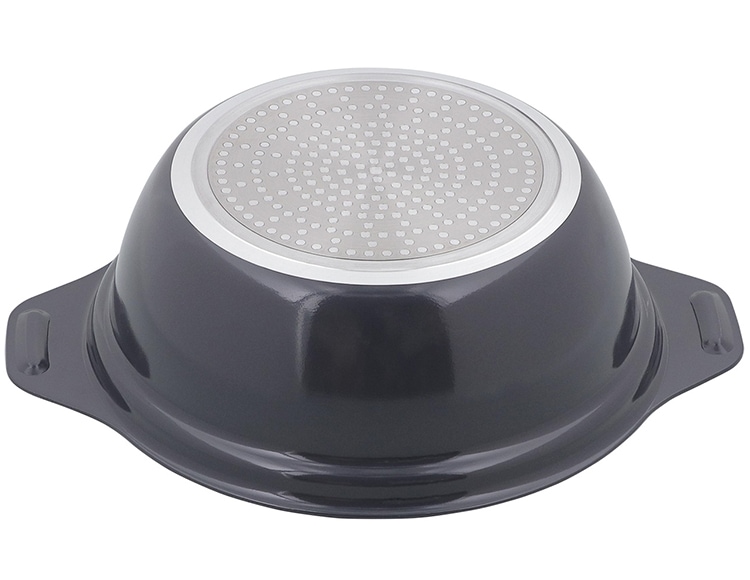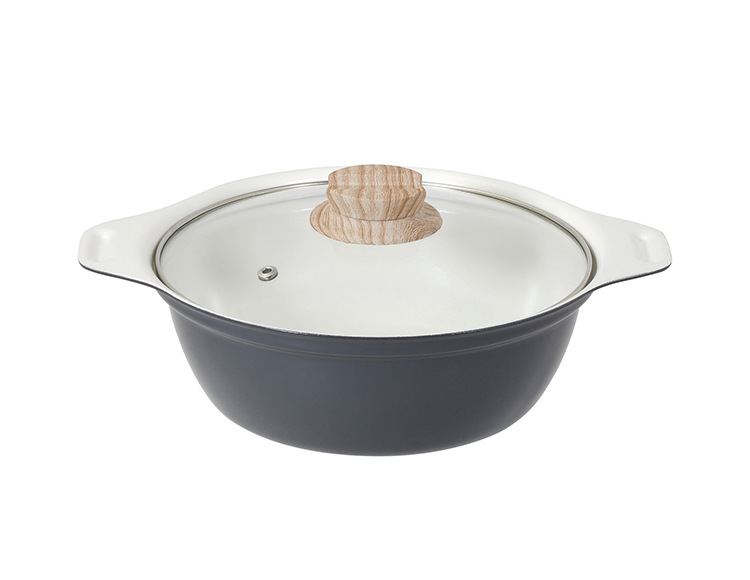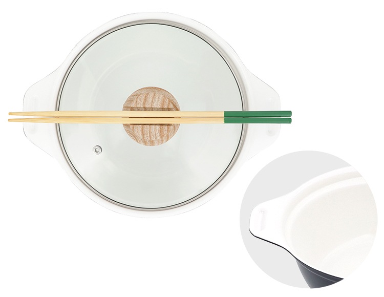 | 材質 | 表面加工/内面:セラミック塗膜加工 外面:(底面を除く)焼付け塗装 本体:アルミニウム合金(底の厚さ:2.4mm ※はり底を含む) はり底:ステンレス鋼(クロム16%) ガラス蓋:強化ガラス(全面物理強化)縁:ステンレス鋼 つまみ:フェノール樹脂 座板フェノール樹脂 |