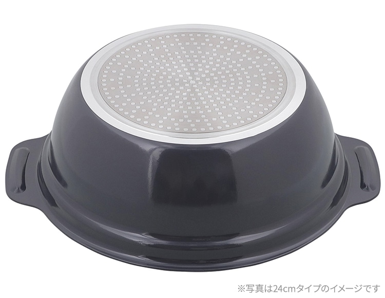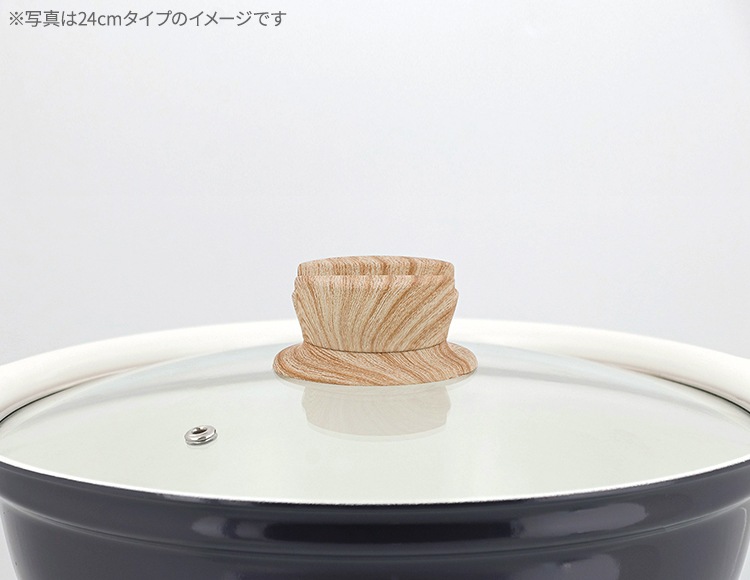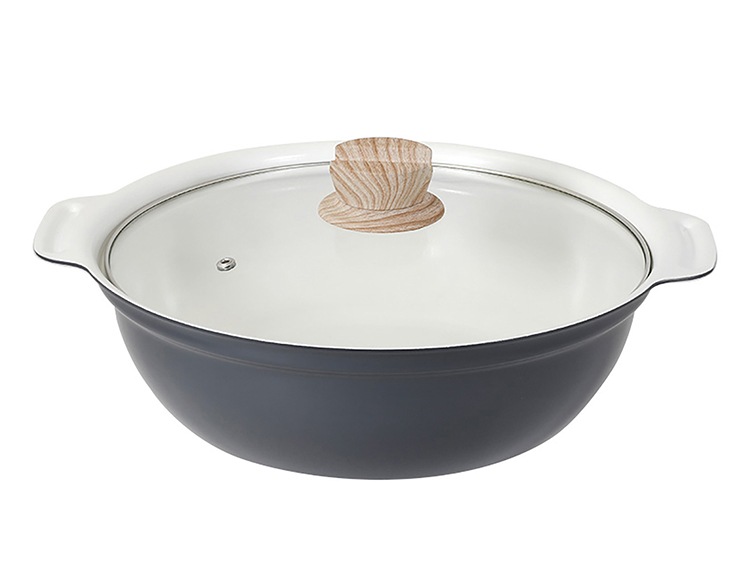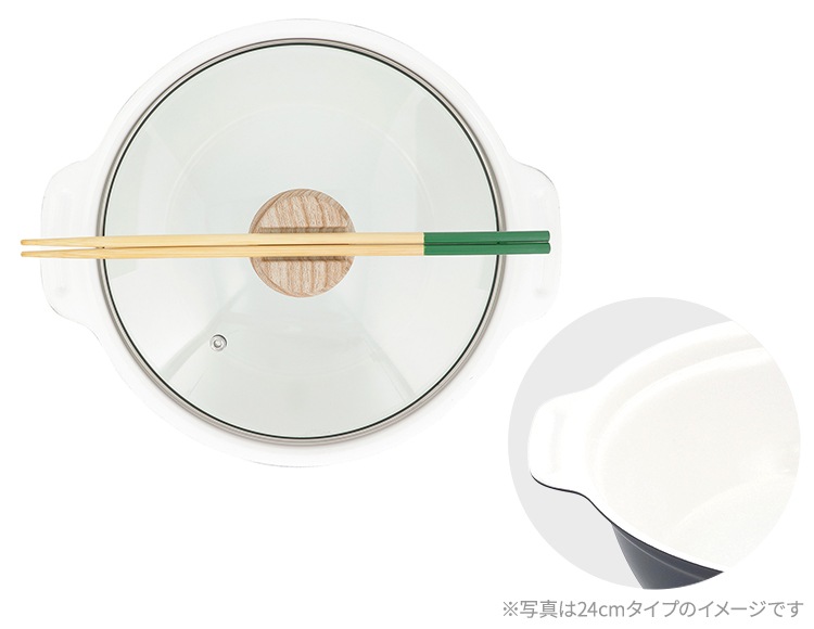 | 材質 | 表面加工/内面:セラミック塗膜加工 外面:(底面を除く)焼付け塗装 本体:アルミニウム合金(底の厚さ:2.6mm ※はり底を含む) はり底:ステンレス鋼(クロム16%) ガラス蓋:強化ガラス(全面物理強化)縁:ステンレス鋼 つまみ:フェノール樹脂 座板フェノール樹脂 |