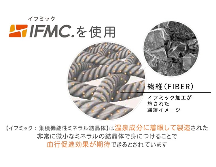 【イフミックス:集積機能性ミネラル結晶体】は温泉成分に着眼して製造された非常に微小なミネラルの結晶体で身につけることで、血行促進効果が期待できるとされています。