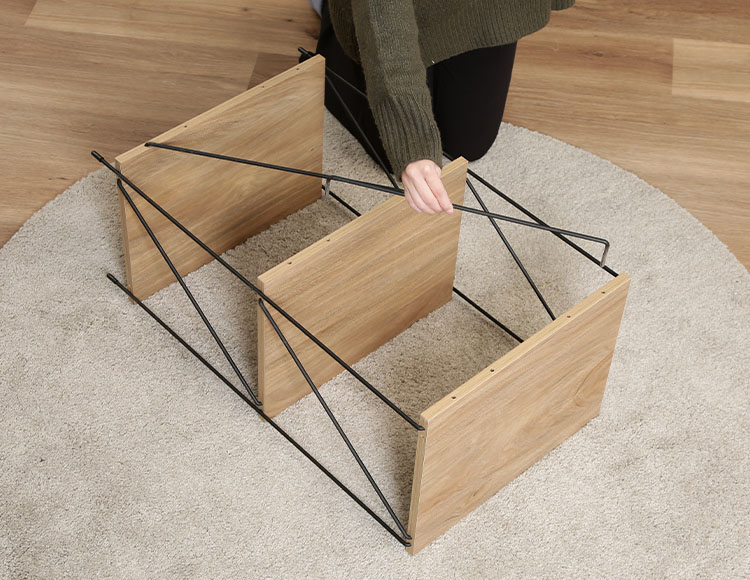 棚板の穴にワイヤーフレームを差し込むだけで完成するワイヤーロックシステムを採用。