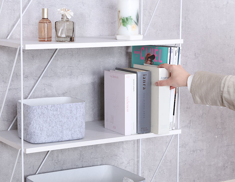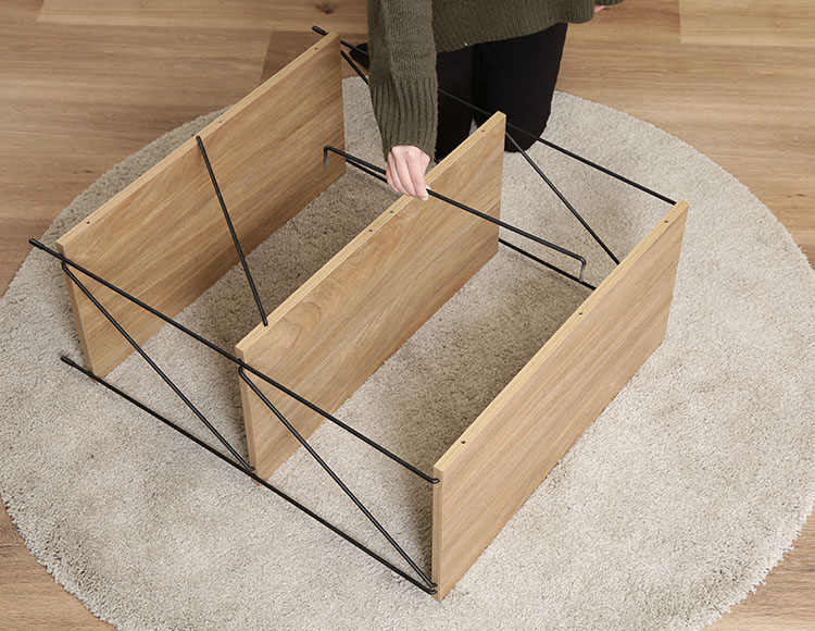 棚板の穴にワイヤーフレームを差し込むだけで完成するワイヤーロックシステムを採用。