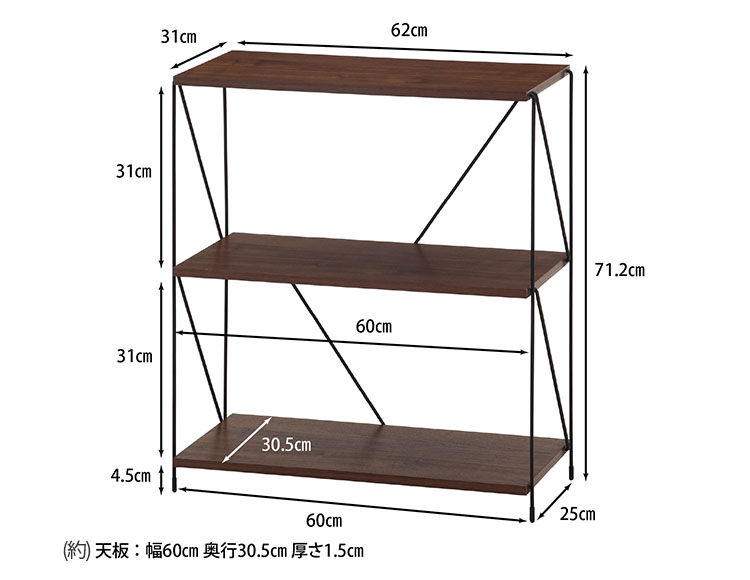 | 規格 | サイズ:全体(約)幅62×奥行31×高さ71.2cm 耐荷重(全体):(約)30kg 耐荷重(棚板):(約)10kg 棚板厚:(約)1.5cm 重量:(約)7.2kg 組み立てについて:差し込み&工具不要の簡単組み立て |