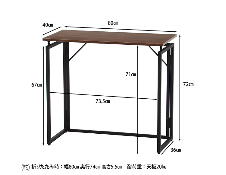 | 規格 | サイズ:全体(約)幅80×奥行40×高さ72cm 折りたたみ時:(約)幅80×奥行74×高さ5.5cm 耐荷重(天板):(約)20kg 重量:(約)6.5kg |