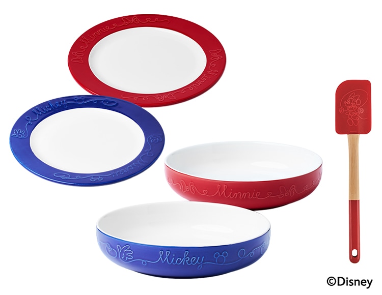 ミッキー&ミニーの華やかな平皿2枚セットは、食卓に明るさを添え、レンジ・オーブン・食洗機対応で使いやすい。スパチュラ付きで、幅広い料理に活躍します。