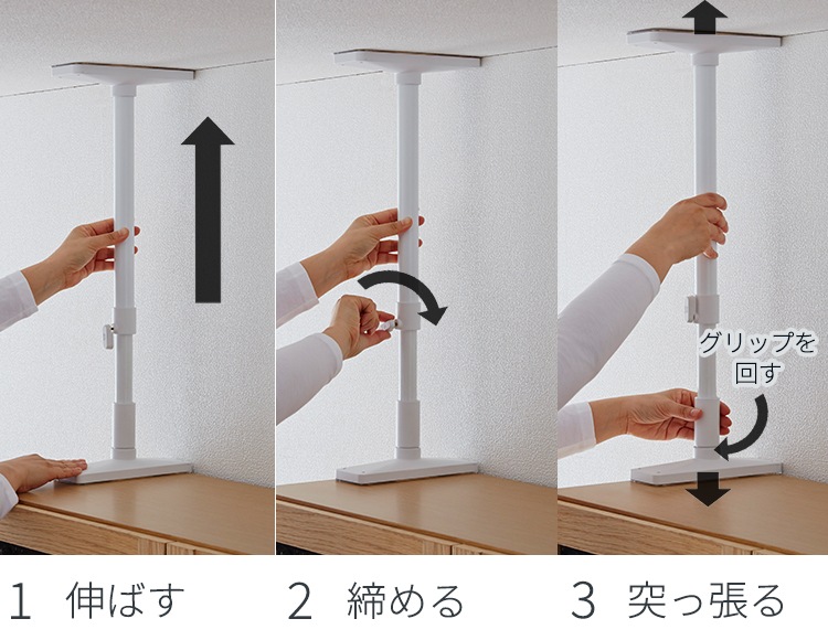 家具の天面と天井の間に取り付けて地震による転倒リスクを減らします。
