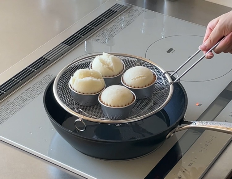 取っ手のない盆ざるはフライパンや鍋に入れやすく、蒸し料理にも最適です。