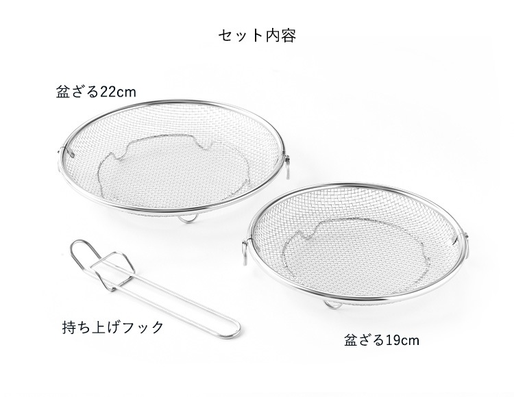 持ち上げフックと盆ざる19cmと22cmがセットになった商品です。