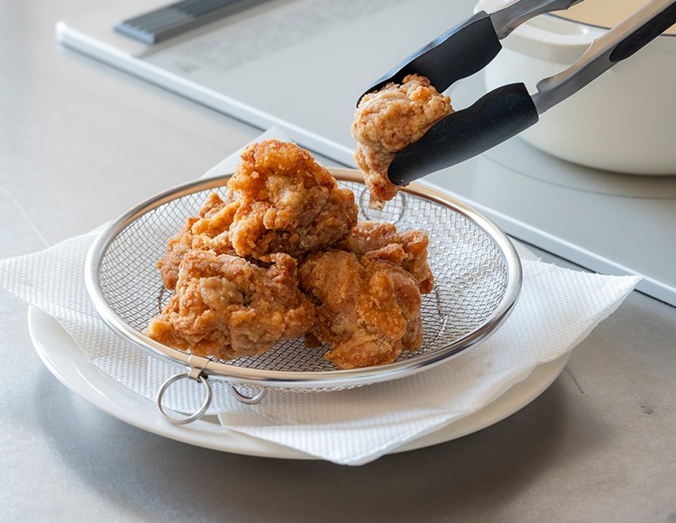 持ち上げフックを使えば、食材に触れずにざるごと移動できるので便利です。