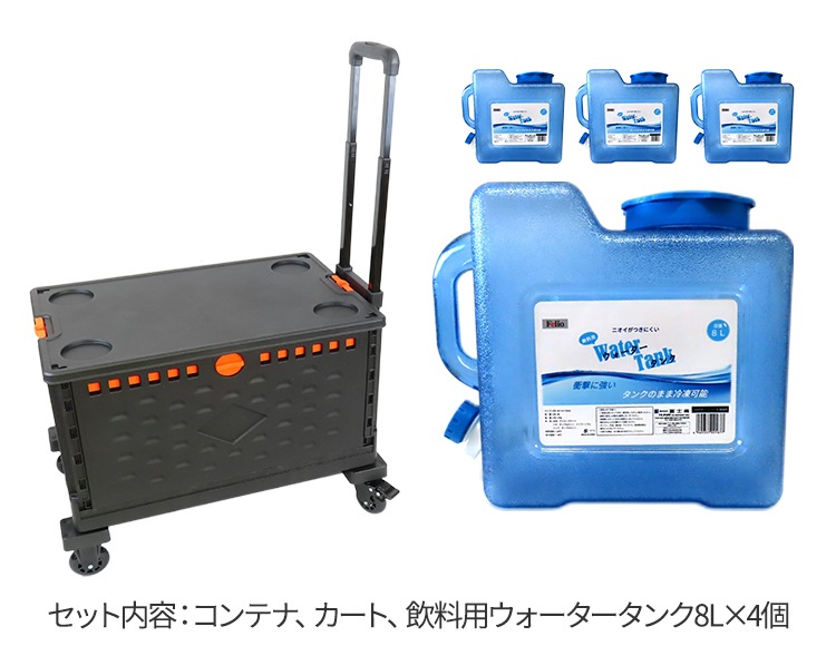 | セット内容 | 飲料用ウォータータンク4個、カート、折りたたみコンテナ |