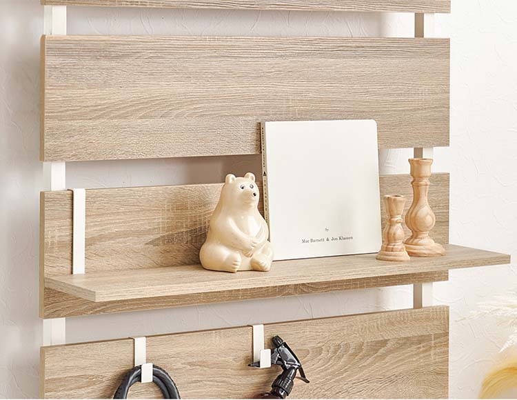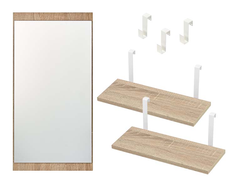 ミラー1枚、フック3個、棚板2枚が付属しています。