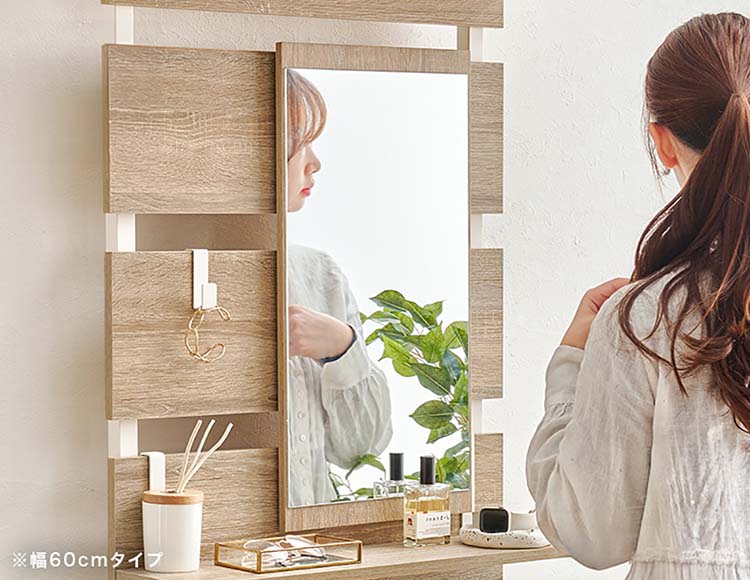 上半身までしっかり入る縦長の大きなミラー。これ1台で身支度できる、うれしい機能です。