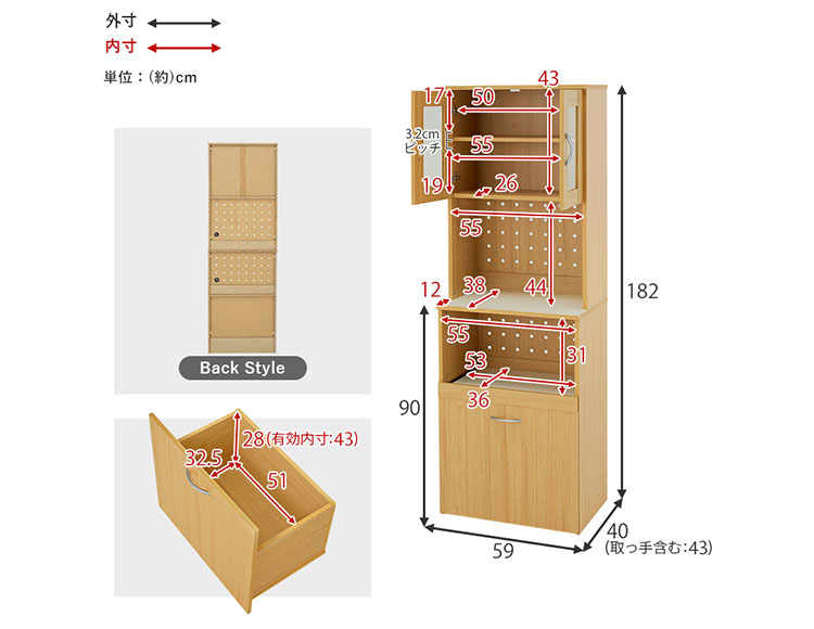 | サイズ(約) | 幅59×奥行43(取手含む)×高さ182cm |