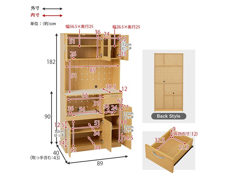 | サイズ(約) | 幅89×奥行43(取手含む)×高さ182cm |