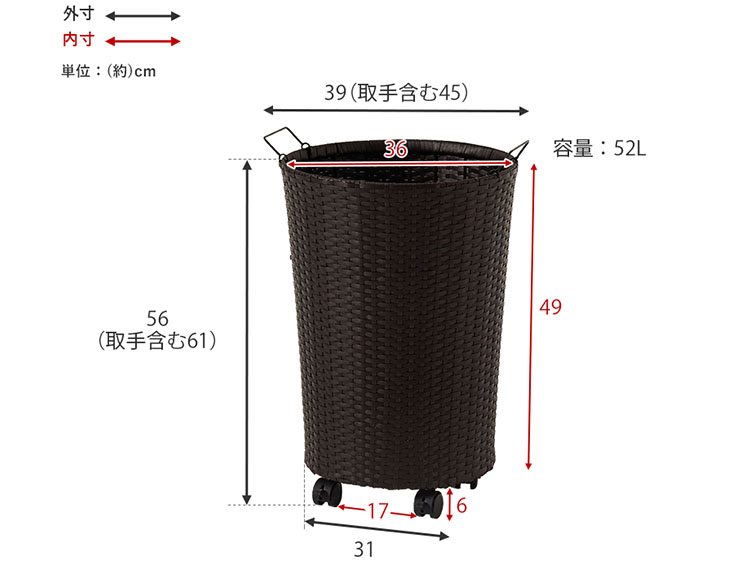 | サイズ(約) | 幅45(取手含む)×奥行39×高さ61(取手含む)cm |