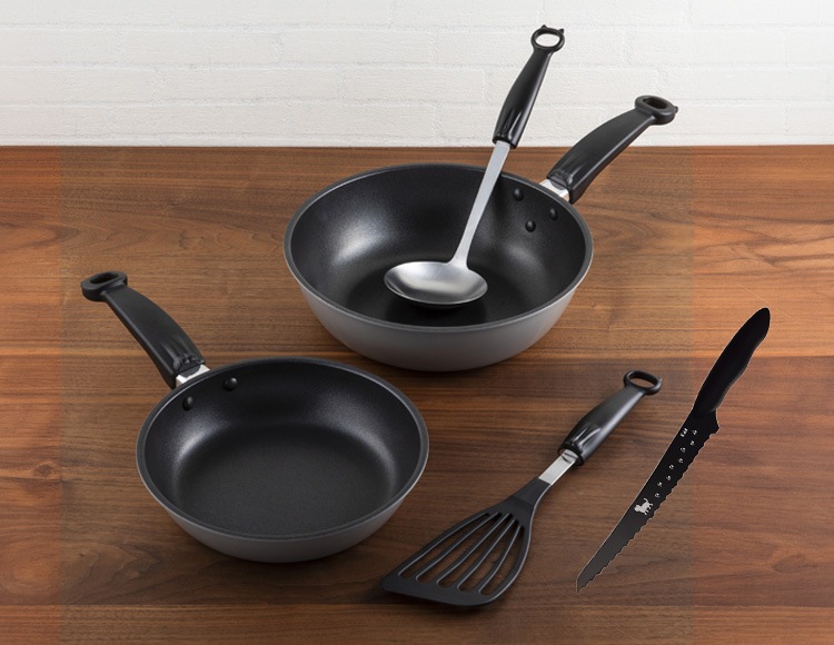 フライパン、炒め鍋、お玉、ビーター(ブラック)のセットとパン切りナイフが一緒になった商品です。