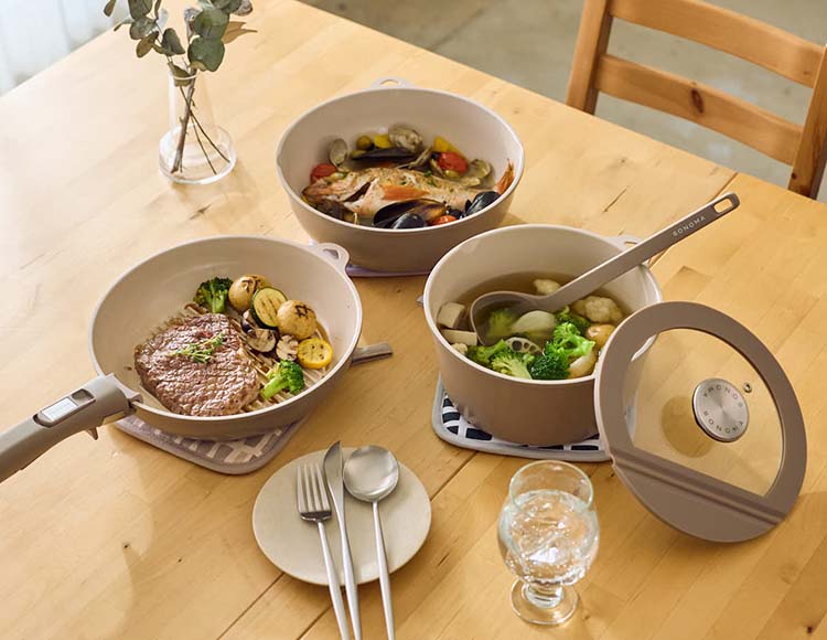 蓋のつまみにSONOMAキッチンツールがマグネットでくっつき、調理中の一時置きに便利です。透明ガラス仕様で、蓋を開けずに中の様子が確認でき、火加減や調理状況の調整がスムーズに。2サイズ展開で、同シリーズのフライパン・ポットいずれにも対応可能です。