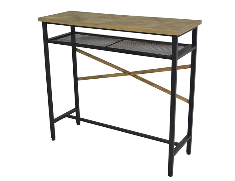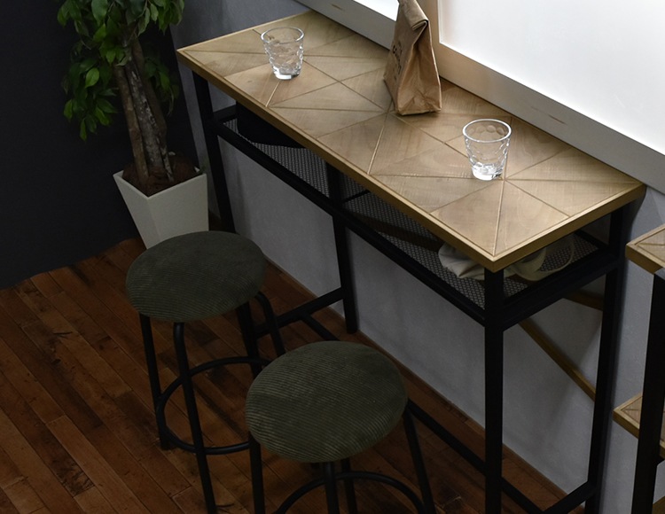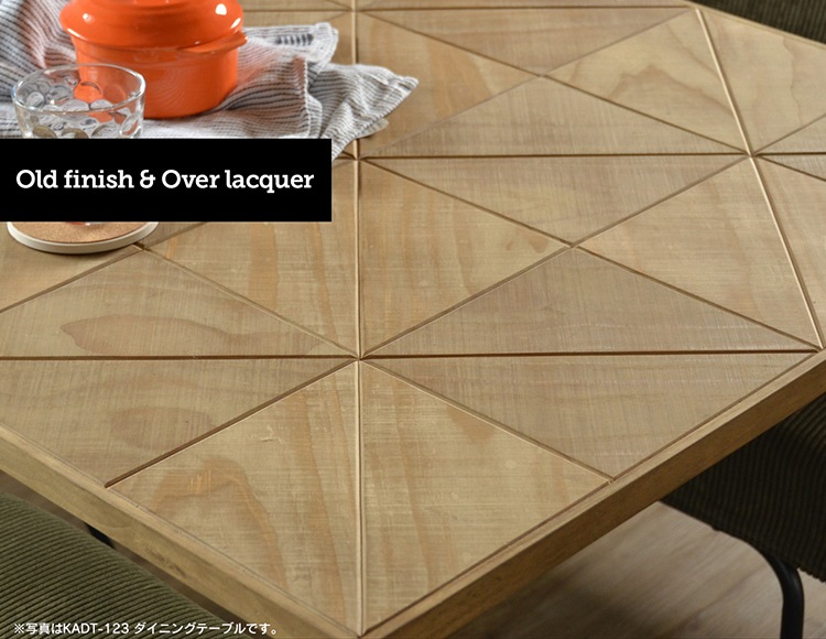 カレイドシリーズは三角形にカットした古材風のパイン材をジオメトリックに並べた質感の高い天板・棚板に、無骨でシンプルなアイアンパイプを組み合わせたシリーズです。