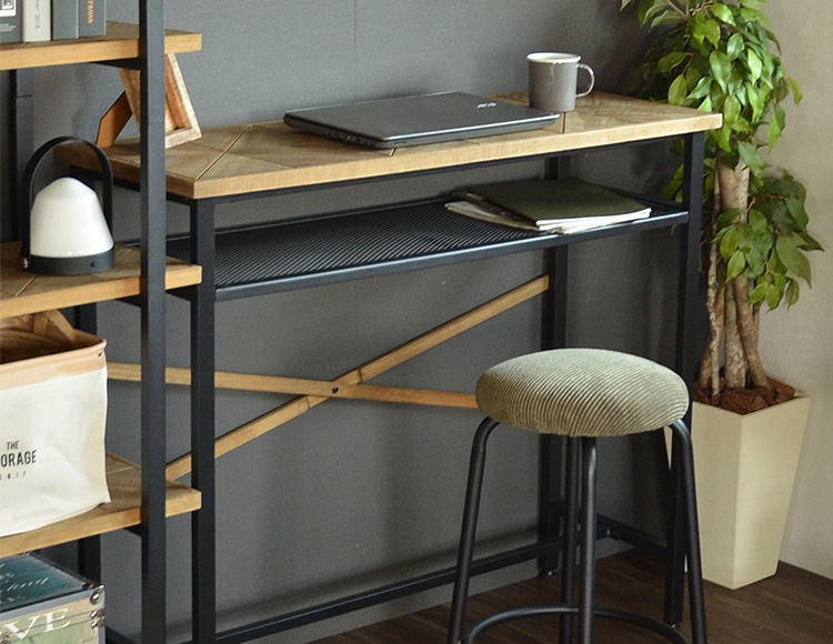 高さ94cmのカウンターテーブルです。メッシュの棚付きでスッキリと整頓できます。