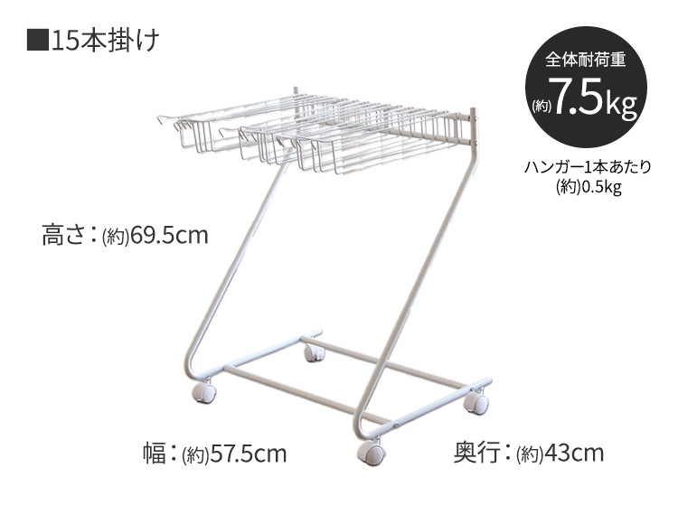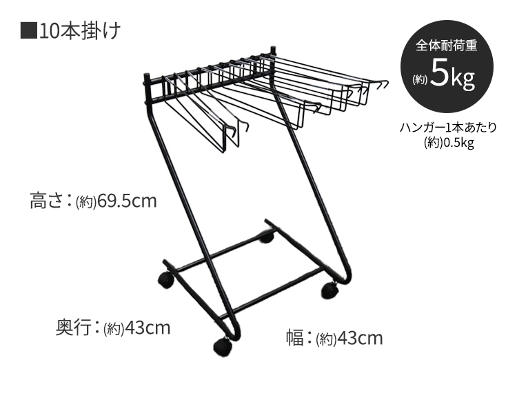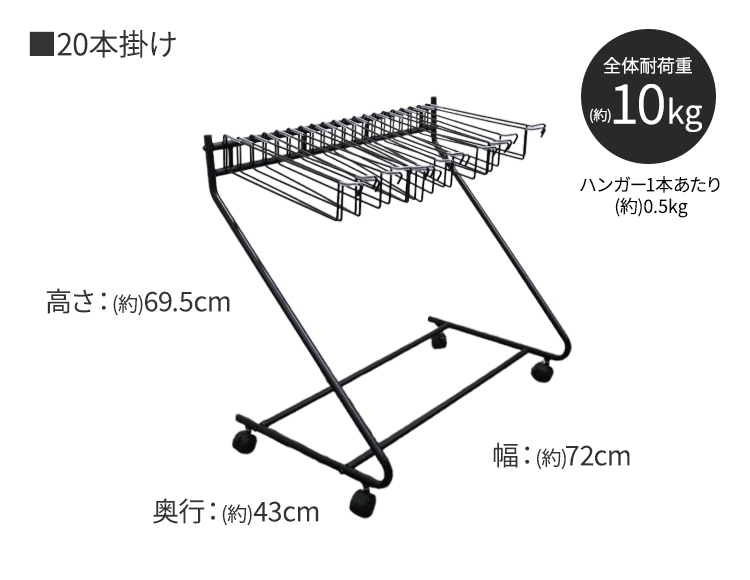 | 耐荷重(約) | 10本掛け:全体5kg 15本掛け:全体7.5kg 20本掛け:全体10kg ハンガー1本:0.5kg |