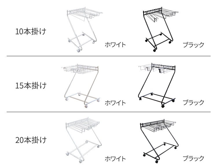 タイプは「10本掛け」「15本掛け」「20本掛け」から。カラーは、ホワイトとブラックからお選びいただけます。