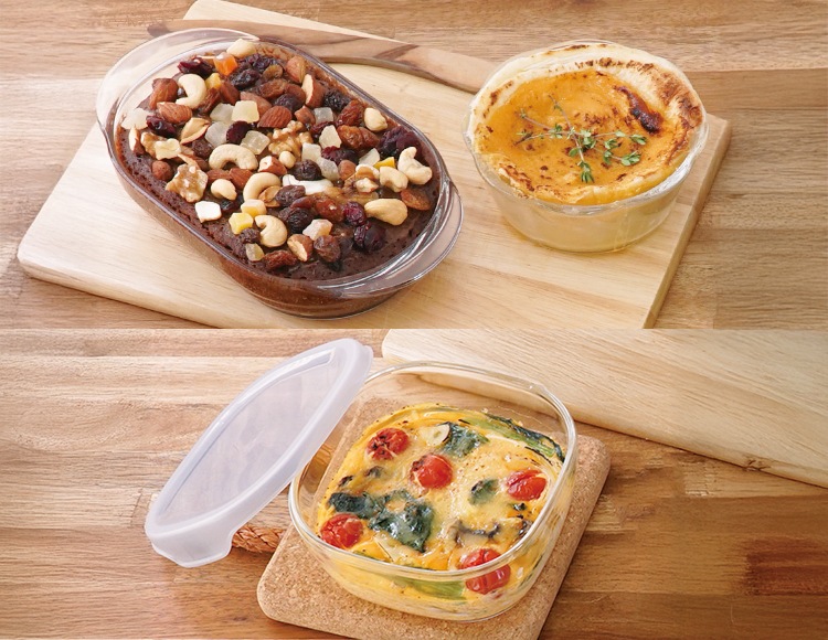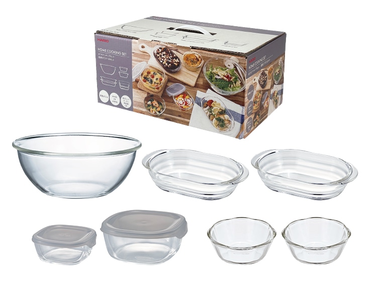 | セット内容 | 耐熱ガラス製浅型ボウル2000 MXP-200-BK(1点)、耐熱ガラス製グラタン皿600 HGZO-60-BK(2点)、耐熱ガラス製スイーツボウル300 SWB-30-BK(2点)、耐熱ガラス製保存容器・角250 KST-25(1点)、耐熱ガラス製保存容器・角600 KST-60(1点) |