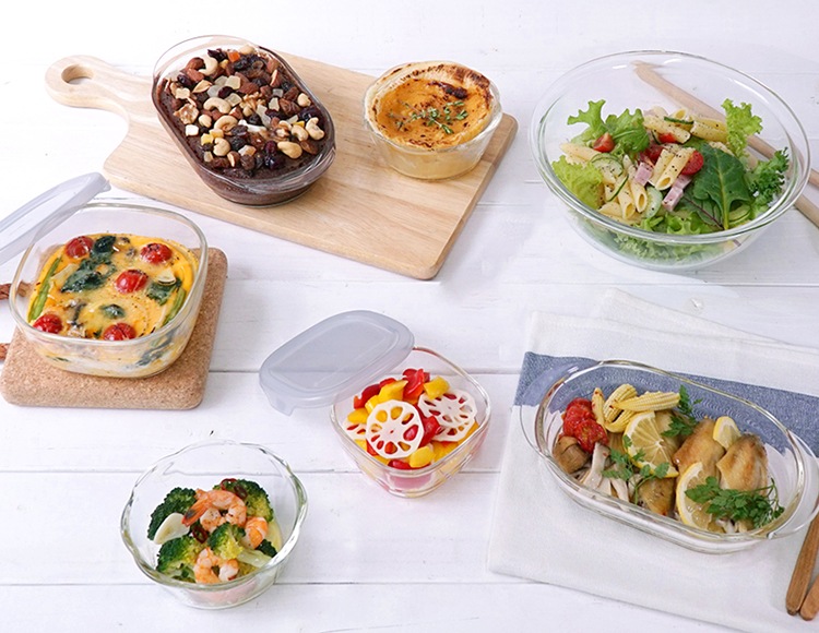 セット内容:耐熱ガラス製浅型ボウル2000 MXP-200-BK(1点)、耐熱ガラス製グラタン皿600 HGZO-60-BK(2点)、耐熱ガラス製スイーツボウル300 SWB-30-BK(2点)、耐熱ガラス製保存容器・角250 KST-25(1点)、耐熱ガラス製保存容器・角600 KST-60(1点)