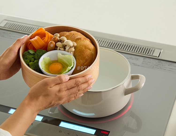 蒸気が食材をやさしく包み込むように、ふんわりと蒸し上げます。