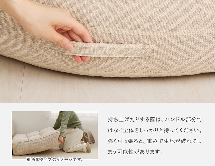木製フレーム等は使用しておらず、中身はたっぷりのわたのみ。やわらかく、万が一転んでぶつかっても怪我の心配がなく安心。