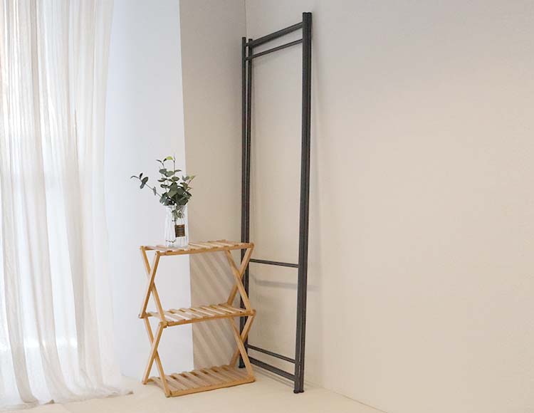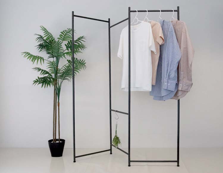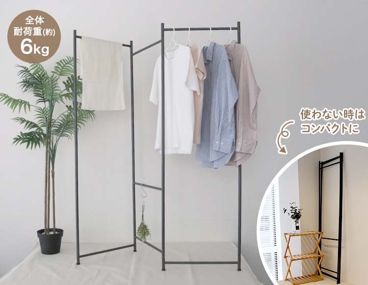 パネル型の折りたたみハンガーラックは、使うときはしっかり衣類を掛けられ、使わないときは折りたたんで省スペースに収納できます。