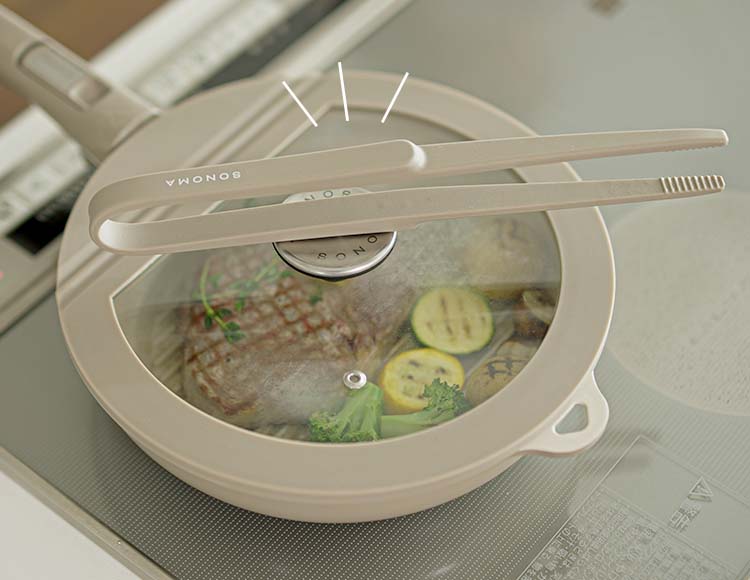 蓋のつまみにSONOMAキッチンツールがマグネットでくっつき、調理中の一時置きに便利です。透明ガラス仕様で、蓋を開けずに中の様子が確認でき、火加減や調理状況の調整がスムーズに。2サイズ展開で、同シリーズのフライパン・ポットいずれにも対応可能です。