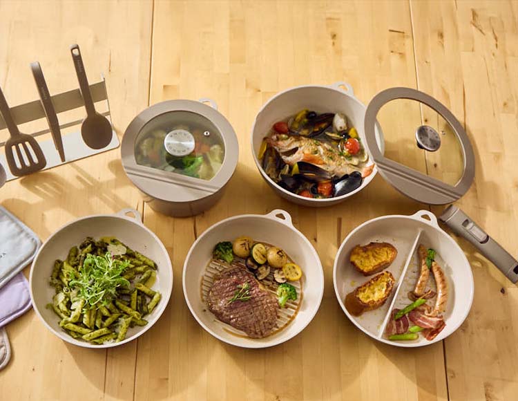 | 生産国 | フライパン・ディープパン・ポット・グリルパン・仕切りパン:韓国 ハンドル・ガラス蓋・レードル・ターナー・スプーン・トング・ツールスタンド・ミトン鍋敷き:中国 |