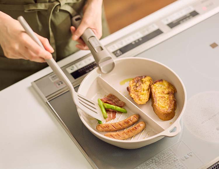 ・2つの料理を同時に調理できる仕切りパン。仕切り高さ3cmで食材が混ざらず、ちょっとした汁気のある料理にも便利。